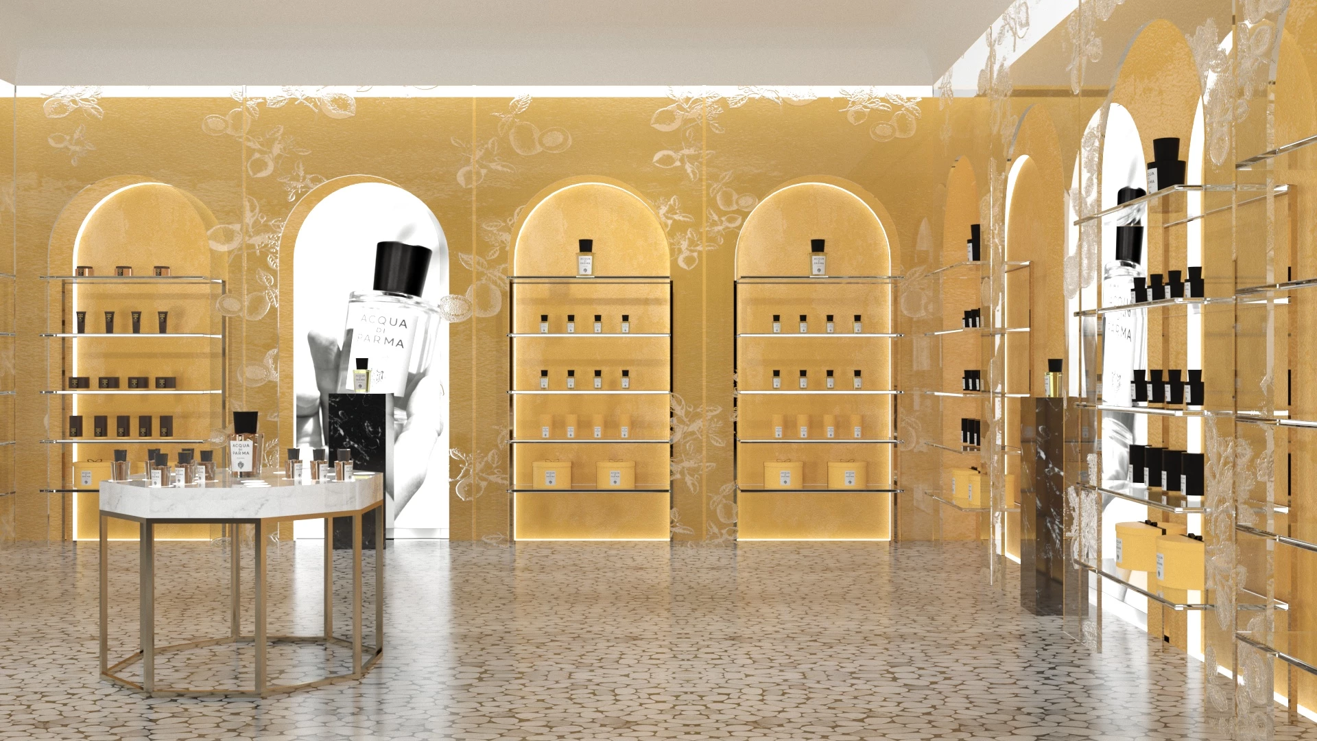 BBA is invited by the LVMH group to participate in the restricted competition for the design of the new concept for Acqua di Parma Brand. The idea was to convey the essence of the brand through the typical colors and italian character of the city of Parma. BBA proposed a reinterpretation of archetypes of the arch and the cloister, typical of the Renaissance buildings, using them to define space and the display of products.