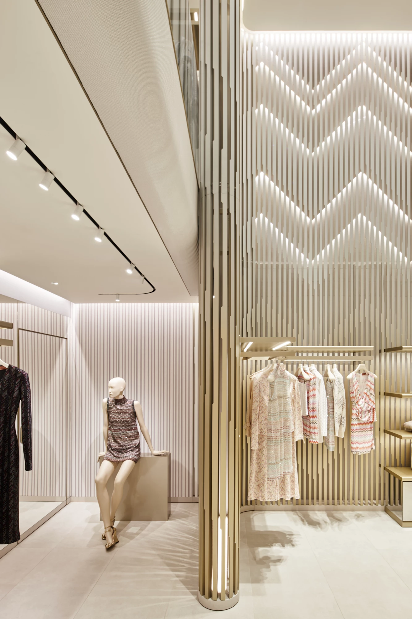The project is located In Montenapoleone Milan's fashion district. The new Missoni boutique presents itself to the public by interpreting the iconic zig-zag pattern characteristic of the brand's fabrics in an architectural form. This motif is rendered through the skillful use of colors, vertical metal elements, and cuts of light that add dynamism to all the boutique's surfaces and coverings.