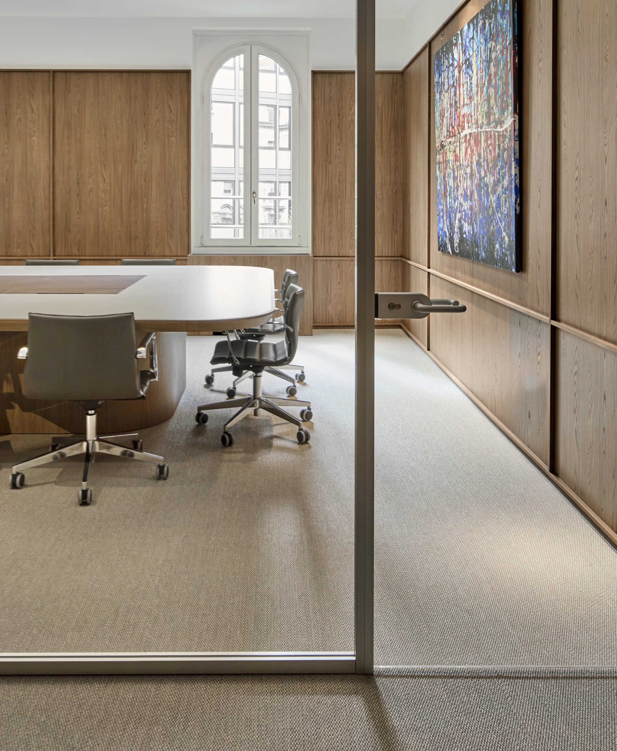 The result is an office that, despite its rigor, feels welcoming and warm, thanks to the use of oak wood paneling. The design of this finish, characterized by clean and rational lines, contributes to a sense of order and discretion, perfectly balanced with the idea of a dynamic and stimulating workplace. The wood, a natural and valuable material, integrates harmoniously with the glass surfaces, creating an elegant, professional, yet welcoming environment that meets the needs of those who work there every day.