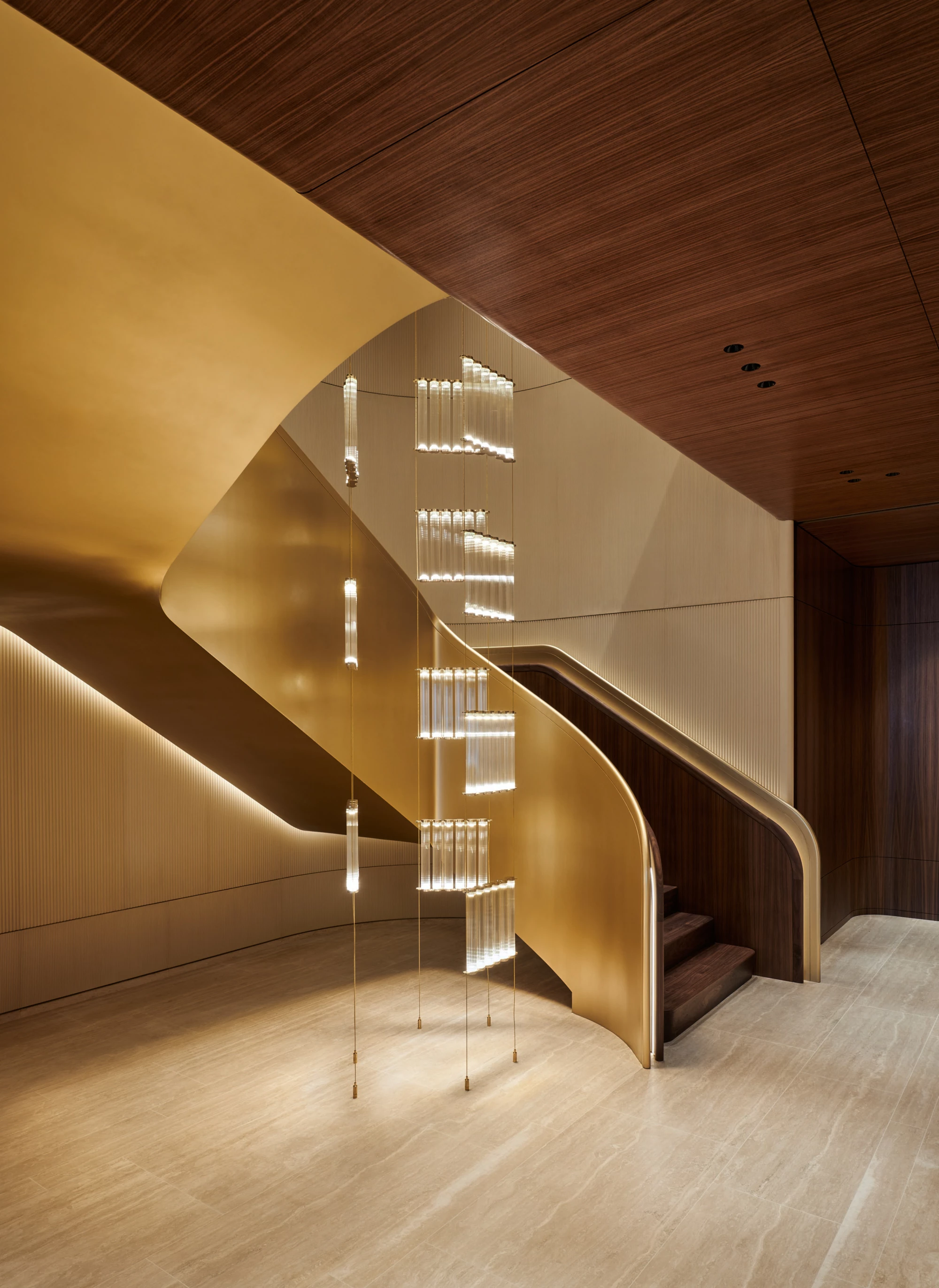 At street level, a natural-stone frame introduces an elegant entryway leading to two floors connected by a custom-designed staircase.
