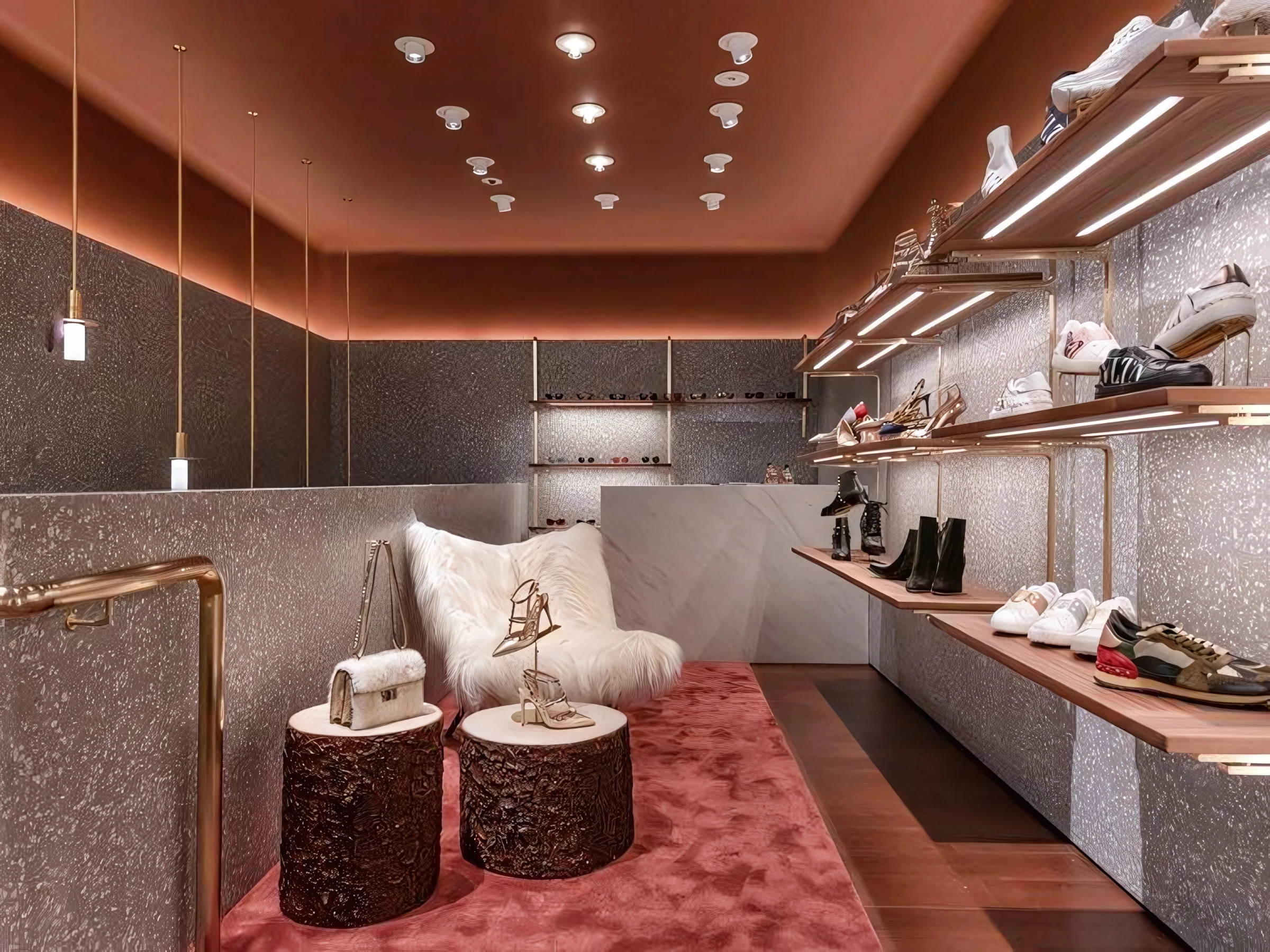 BBA in collaboration with the Valentino technical office has developed a variation of the David Chipperfield concept exclusively for the boutiques located in ski resorts. Warm colors have been applied on walls and ceilings and a selection of vintage furnishings and accessories with a purely Nordic aesthetic have been proposed, resulting in a surprising atmosphere.